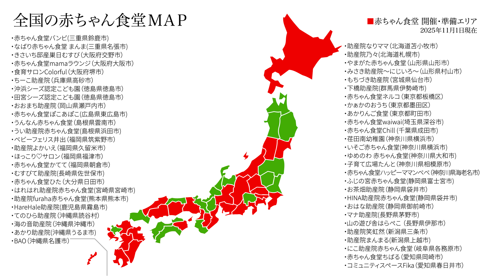 SERVICE 全国赤ちゃん食堂設立・運営支援 全国に先駆けてスタートした赤ちゃん食堂。 全国各地から赤ちゃん食堂開設の相談や見学に来てくださっています。全国に同じ志を持つ各団体とネットワークを構築することで、産後の孤立を防ぎ、赤ちゃんの成長を支える地域の拠点づくりを行っています。 運営者同士のつながりに加え、行政や関係団体との連携にも力を入れています。 赤ちゃん食堂プロジェクトままなでは、赤ちゃん食堂の立ち上げ支援、運営サポートの他、赤ちゃん食堂を応援してくれる企業・団体と各赤ちゃん食堂団体の架け橋となり、継続した食堂の運営と、より多くの方の社会参加を実現することで、産後に誰も孤立しない社会を目指しています。 ※赤ちゃん食堂MAPに掲載させていただける団体も随時募集しております。当団体までご連絡ください。 赤ちゃん食堂設立・運営支援に関する問合せ 設立・運営支援の事例 野県伊那市のこども園さんが離乳食を元々提供しているという保育園の強みを活かし、見学から1か月で赤ちゃん食堂をスタートさせました。 埼玉県深谷市のご夫婦。保育士や助産師といった専門の資格を持っていなくても赤ちゃん食堂ができるのか?と相談、見学にいらしました。地域のボランティアの力を結集し、赤ちゃん食堂を開始。毎回予約がすぐに埋まるほど、大盛況で本当にやってよかったと喜びの声をいただきました。 愛知県岡崎市の飲食店さんに、前期~完了期までの各期の離乳食づくりのノウハウをお伝え。定期的に赤ちゃん食堂を開催され、市内外から家族連れが集まってくるそうです。 赤ちゃん食堂waiwaiさんと こども園山の遊び舎はらぺこさんと ご支援・ご寄付はこちら